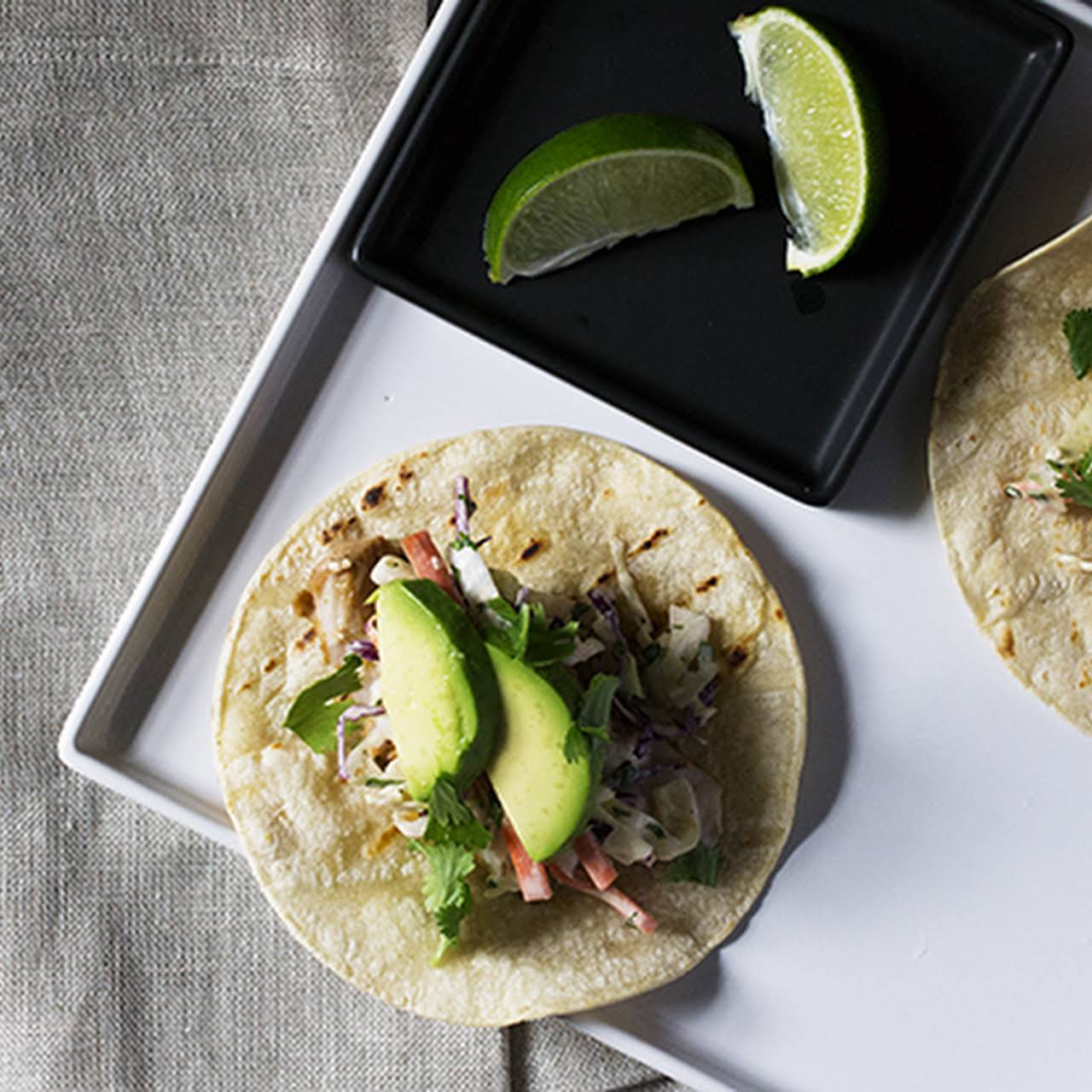Top with sriracha aioli slaw, sliced avocado, and limes wedges.